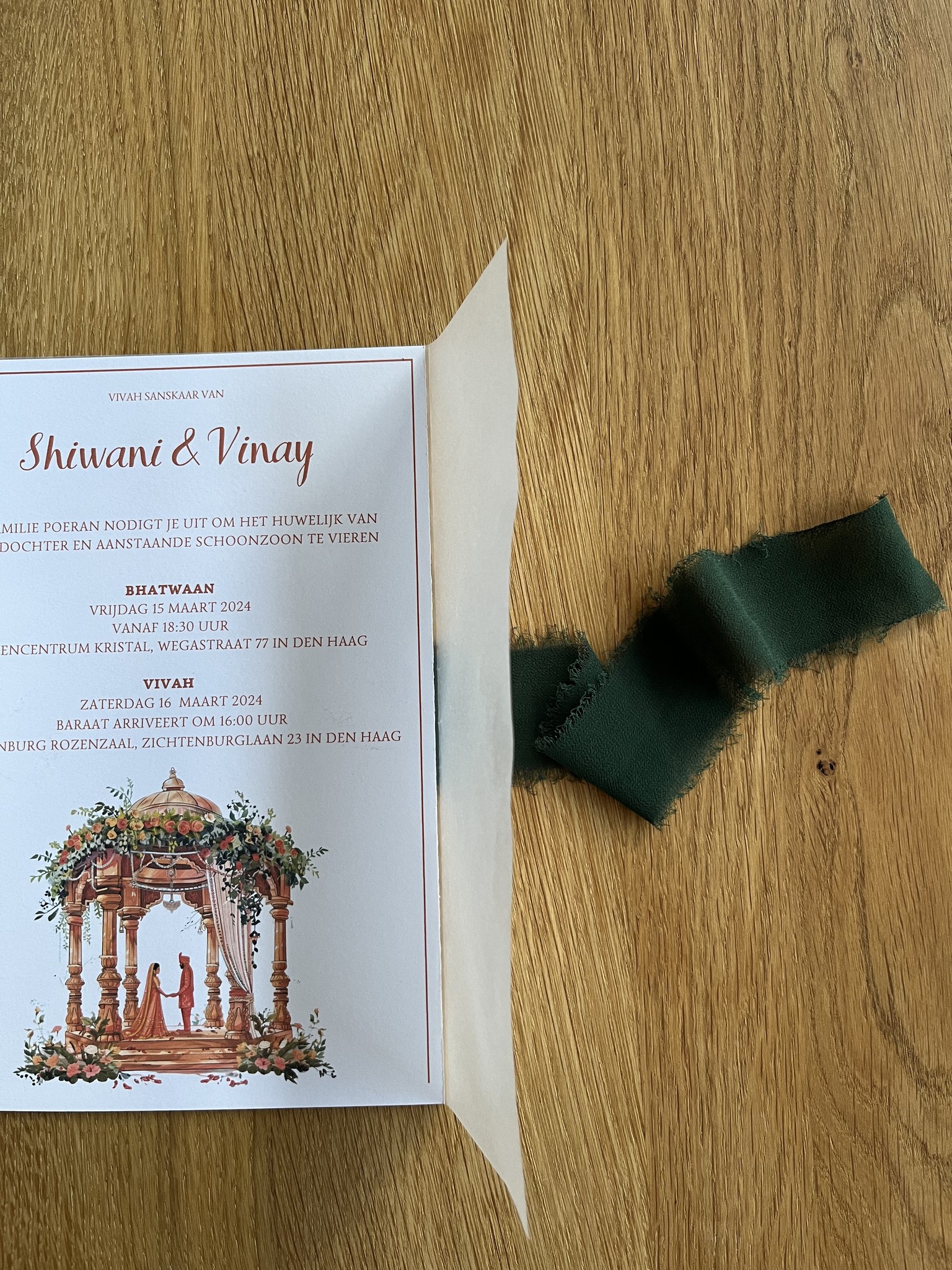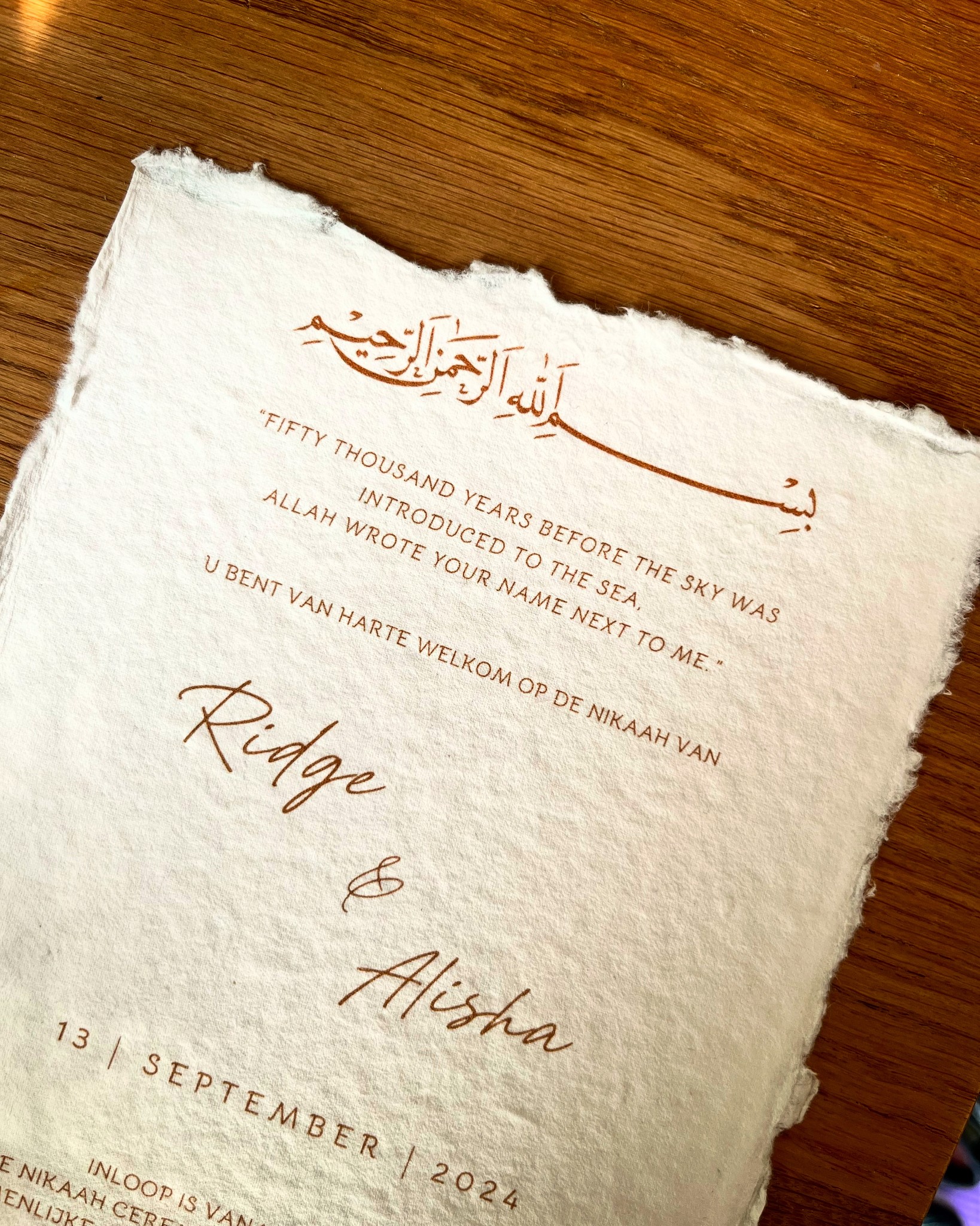 Je kunt kiezen uit verge (200 gram) of mat (160 gram) papier. Ik maak elke uitnodiging met zorg: van het ontwerpen tot het printen en het met de hand samenstellen.